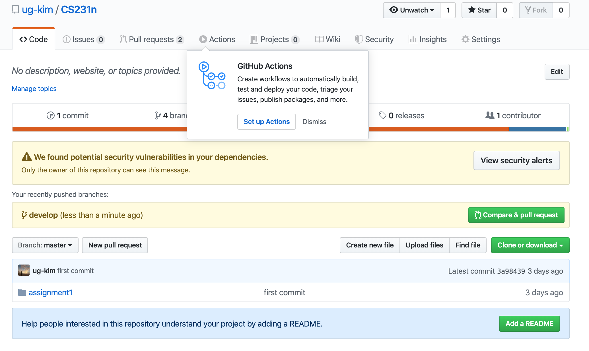 - develop라는 이름의 새로운 branch를 만들었고, master 포함해서 2개의 브랜치가 존재함을 알 수 있다.