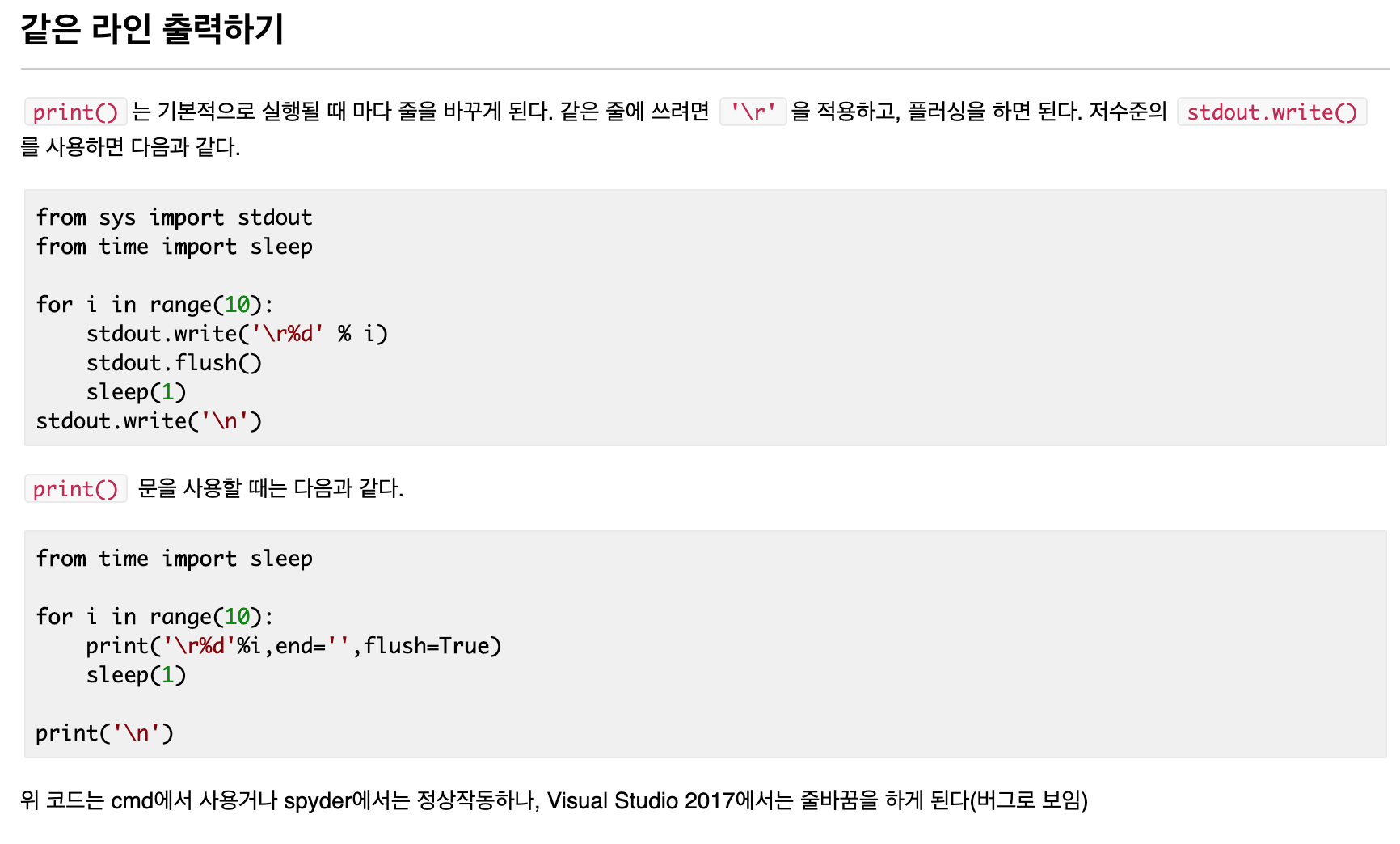 하지만 위의 sys.stdout.write('\r')은 cmd에서 사용하거나 spyder에서는 정상작동하나, Visual Studio 2017에서는 줄바꿈을 하게 된다. 이는 버그로 보인다고 위키독스에 나와있다. 나는 VSCode 2019인데도 버그가 난다. 물론 가끔씩 같은 라인으로 출력되었다가 갑자기 새로운 라인으로 출력되거나 한다. 버그라는 것이 맞는 설명인 것 같다.