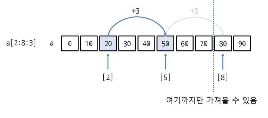 >>> a[2:8:3] # 인덱스 2부터 3씩 증가시키면서 인덱스 7까지 가져옴