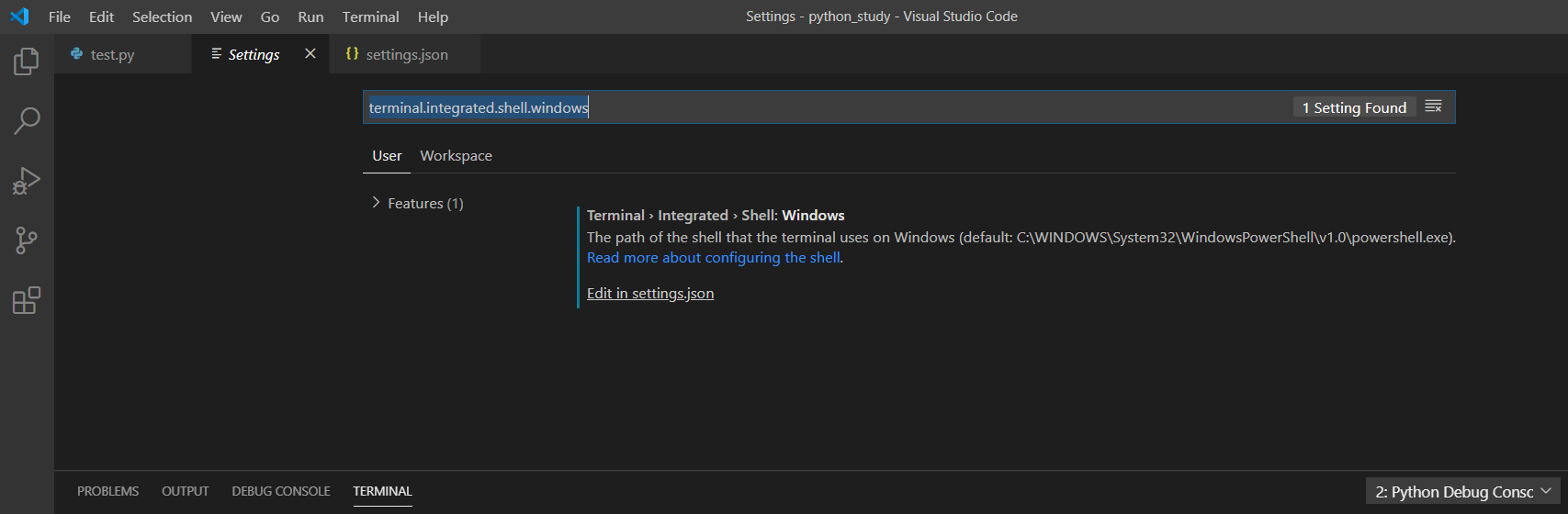 - 검색창에 terminal.integrated.shell.windows 를 입력한다