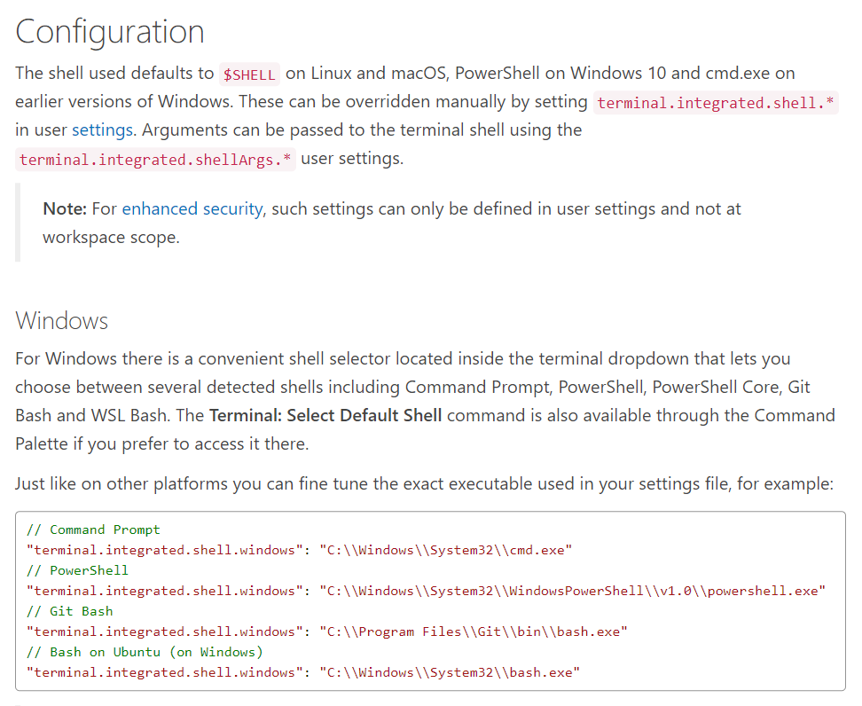 위의 글처럼 terminal.integrated.shell.windows를 덮어씀으로써 터미널 설정을 변경할 수 있다고 한다.