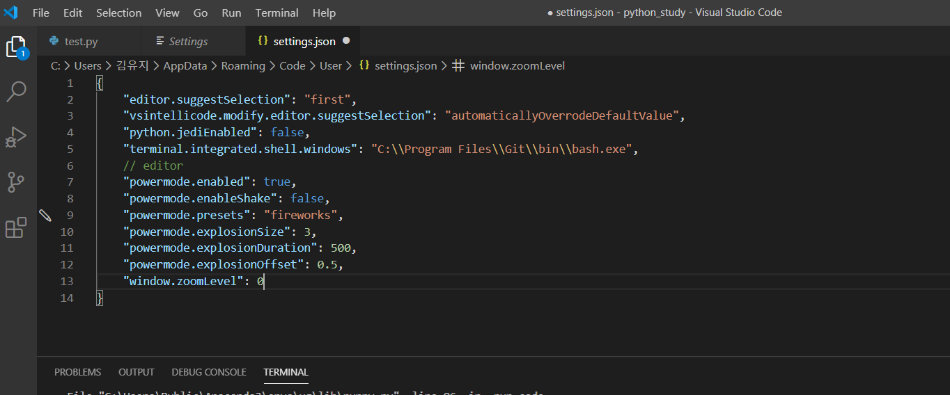 "terminal.integrated.shell.windows": "C:\\Program Files\\Git\\bin\\bash.exe" 를 적어주었습니다