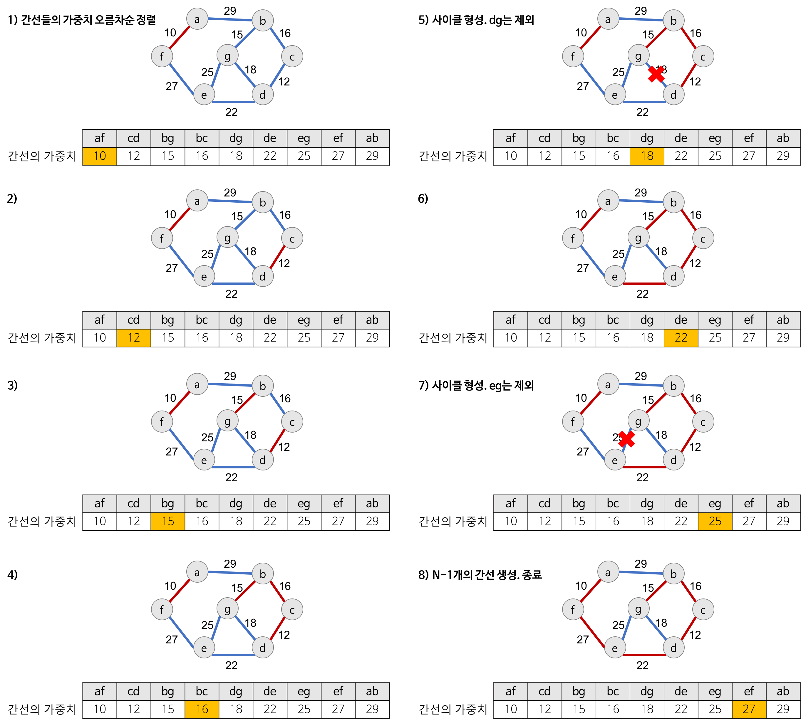 의 조건에 근거하여 각 단계에서 사이클을 이루지 않는 최소 비용 간선을 선택한다