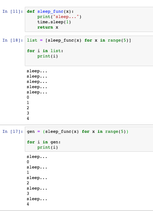 하지만 Generator의 경우 generator를 생성할 대는 실제 값을 한번에 로딩하는 것이 아니고, for문이 수행될 때 sleep_func()을 한 번씩 수행하며 값을 불러오게 된다.
