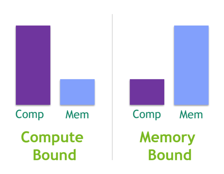 즉 computational problem을 해결할 때, 시간을 주로 계산하는데 쓰냐(compute), memory를 사용하는데 쓰냐(memory)인데, compute bound는 계산하는데 걸리는 시간이 문제를 해결하는데 주로 차지하는 시간이라는 의미이다.