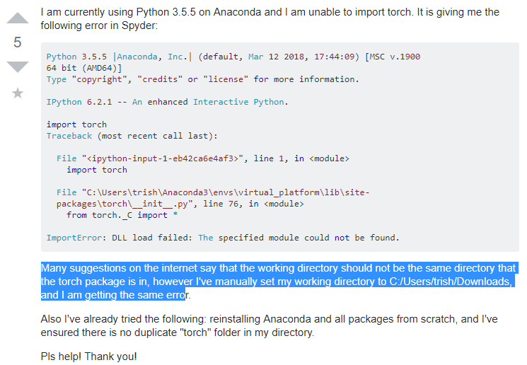 I am currently using Python 3.5.5 on Anaconda and I am unable to import torch. It is giving me the following error in Spyder: Python 3.5.5 |Anaconda, Inc.| (default, Mar 12 2018, 17:44:09) [MSC v...