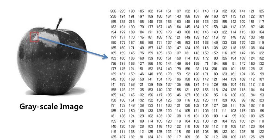 - 각 픽셀의 밝기 값을 0~255 사이 값으로 표현한 이미지이다.