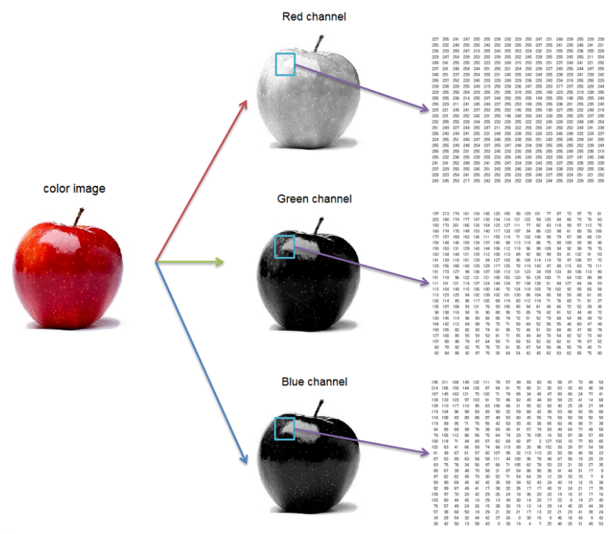 - 컬러 영상은 3개의 채널로 표현된다. 빛의 3원색인 빨강(Red), 녹색(Green), 파랑(Blue)이다.